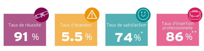 Chiffres de l’année 2025 concernant les taux de réussite, d'abandon, de satisfaction et d'insertion.